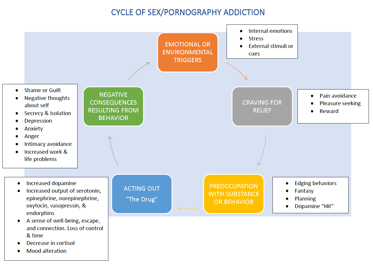 Many who come into therapy to finally deal with this reality are usually facing some type of life crisis and burdened with shame, fear, and confusion. To help understand the “why” of the addiction, which is also a very complex learning, I begin with teaching the cycle of addiction, which normalizes and identifies the out-of-control compulsive behaviors that keep repeating, even with the best intentions of stopping.